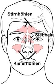 Eine der Nasennebenhöhlen. Zu den Nasennebenhöhlen gehören die Stirnhöhle (Sinus frontalis), die Kieferhöhle (Sinus maxillaris), die Siebbeinzellen (Sinus ethmoidalis) und die Keilbeinhöhle (Sinus sphenoidalis). Die Nasennebenhöhlen sind lufthaltige, mit Schleimhaut ausgekleidete Hohlräume im Gesichtsschädel, die mit der Nasenhöhle in Verbindung stehen und eine funktionelle Einheit bilden.